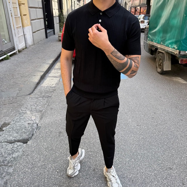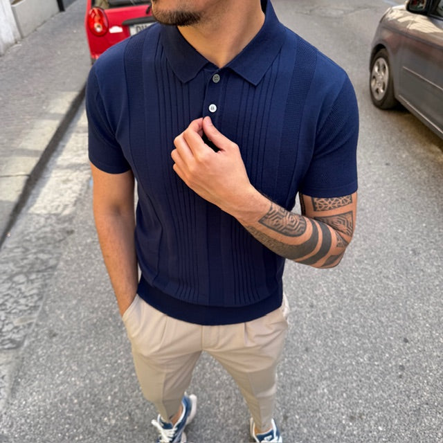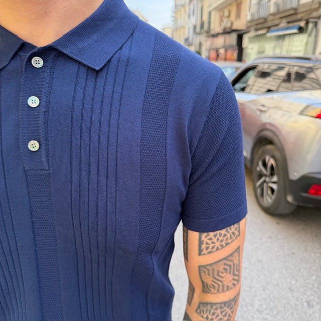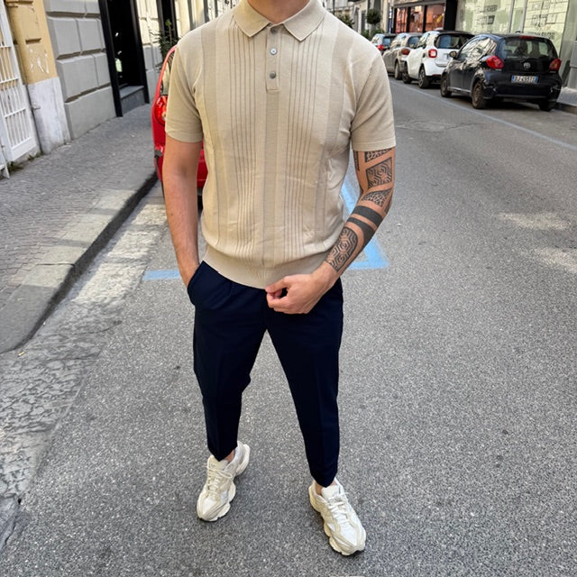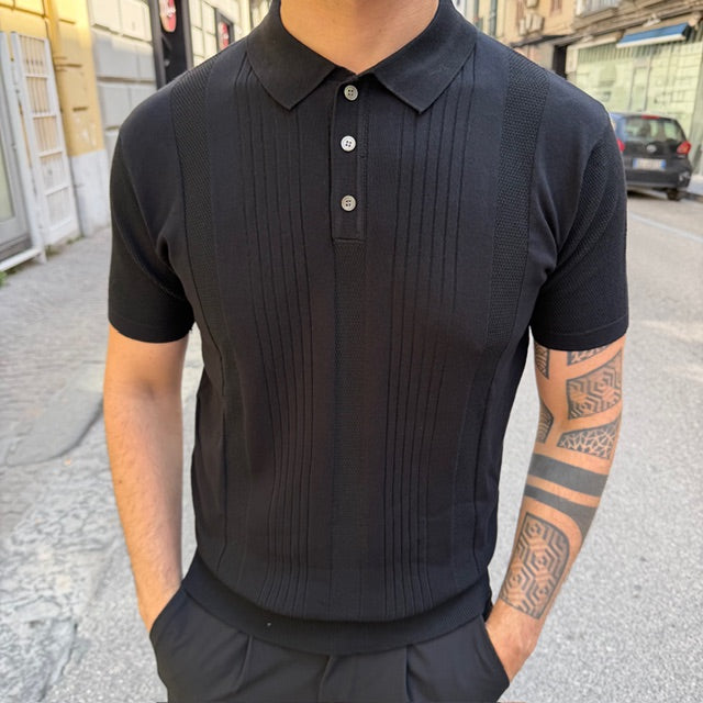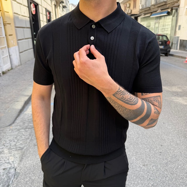 Realizzata in maglia leggera e traspirante, si distingue per la raffinata lavorazione verticale che dona struttura e slancia la silhouette. Il design è valorizzato da inserti a texture differenziata che creano un gioco di contrasti tono su tono, aggiungendo profondità e carattere al capo.
