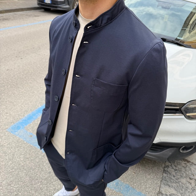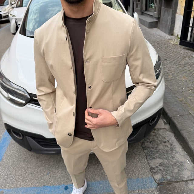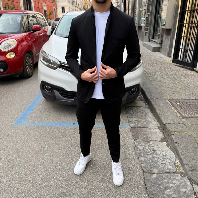 La giacca è il vero punto di forza del completo. Il collo coreano dona un tocco ricercato e originale, rompendo gli schemi della classica giacca sartoriale.