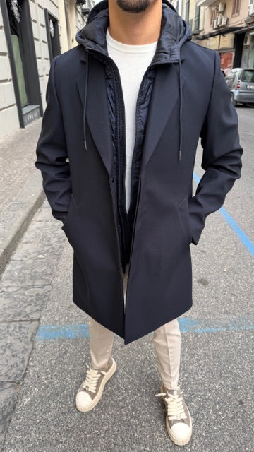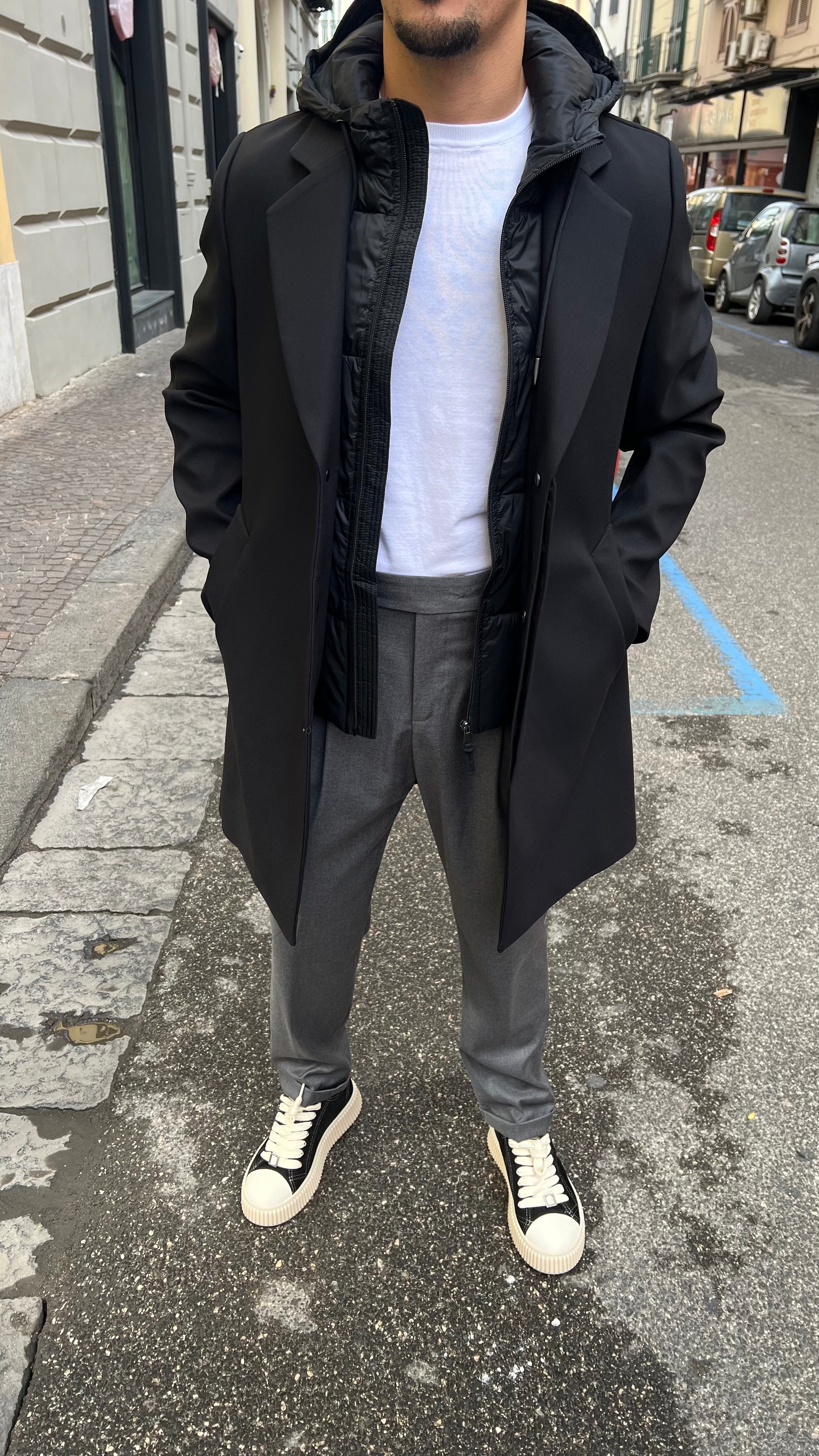 Cappotto regular fit in misto viscosa, morbido e confortevole. Il cappotto è dotato di una pettorina estraibile con cappuccio, imbottita con eco-imbottitura DuPont Sorona®, fibra riconosciuta per le elevate prestazioni tecniche in termini di elasticità, mantenimento delle forme e soprattutto per l'elevato comfort termico. Il cappotto presenta chiusura con bottoni e due tasche a filetto frontali. Un modello dalle linee classiche, che Antony Morato reinterpreta in modo contemporaneo.