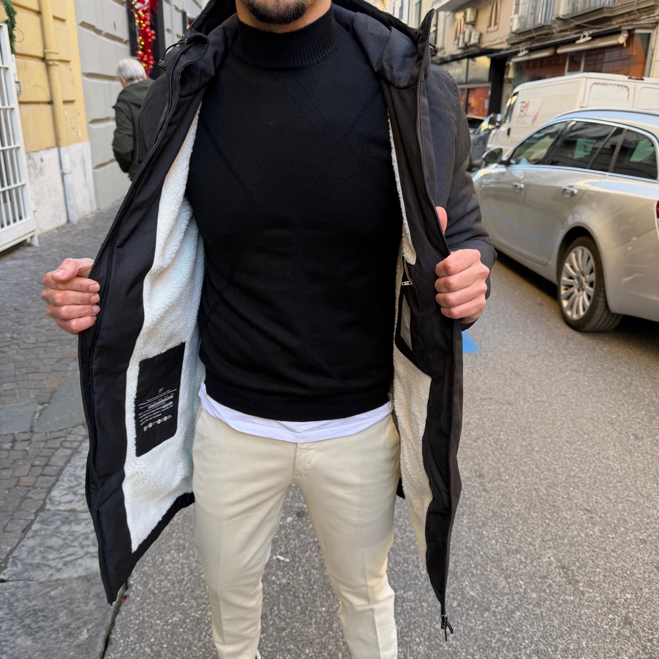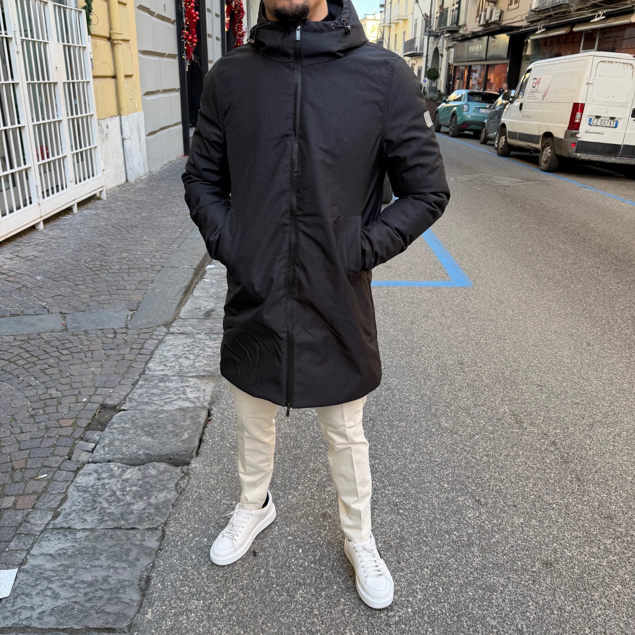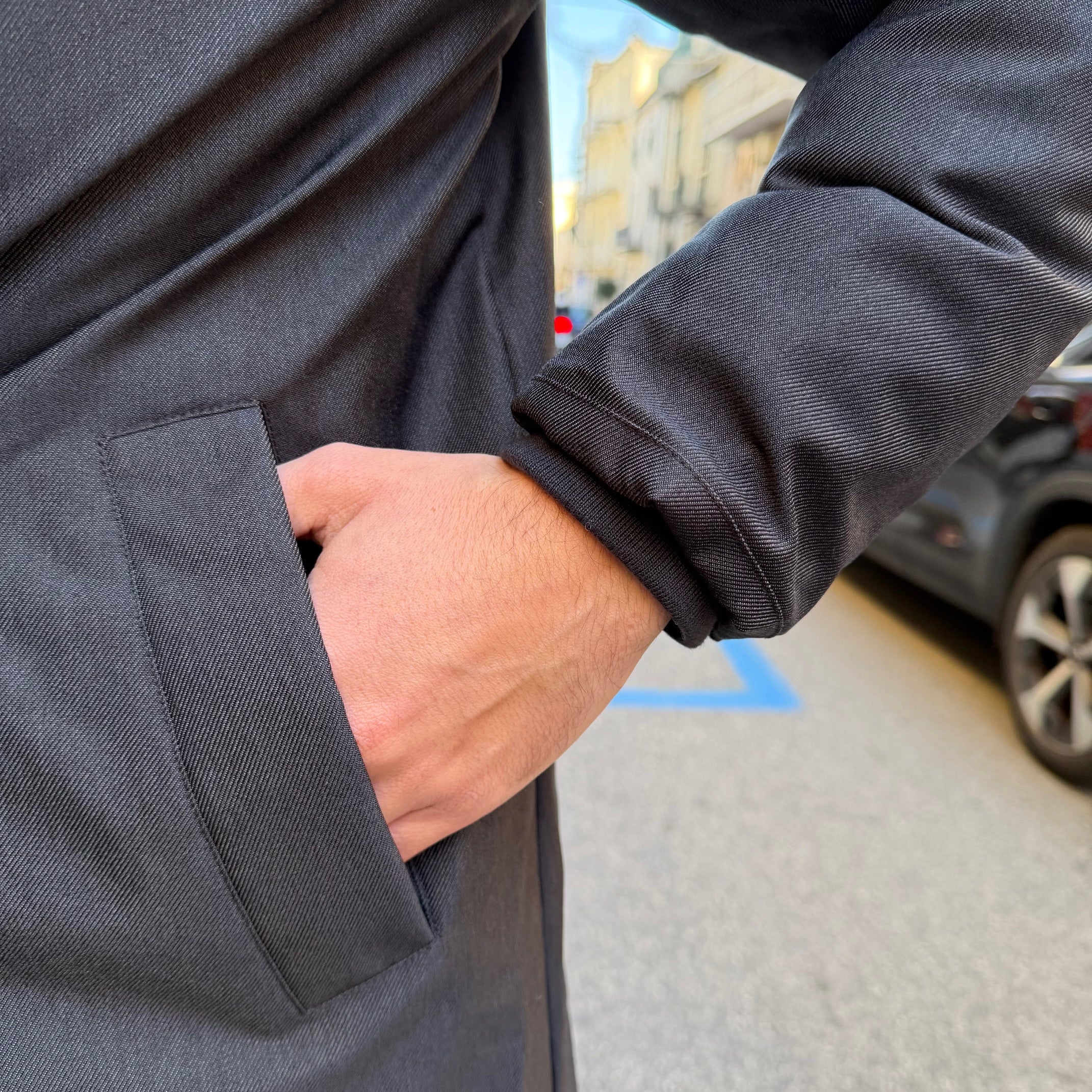 - Realizzato in tessuto tecnico resistente ed elegante che garantisce protezione dal vento e dal freddo
