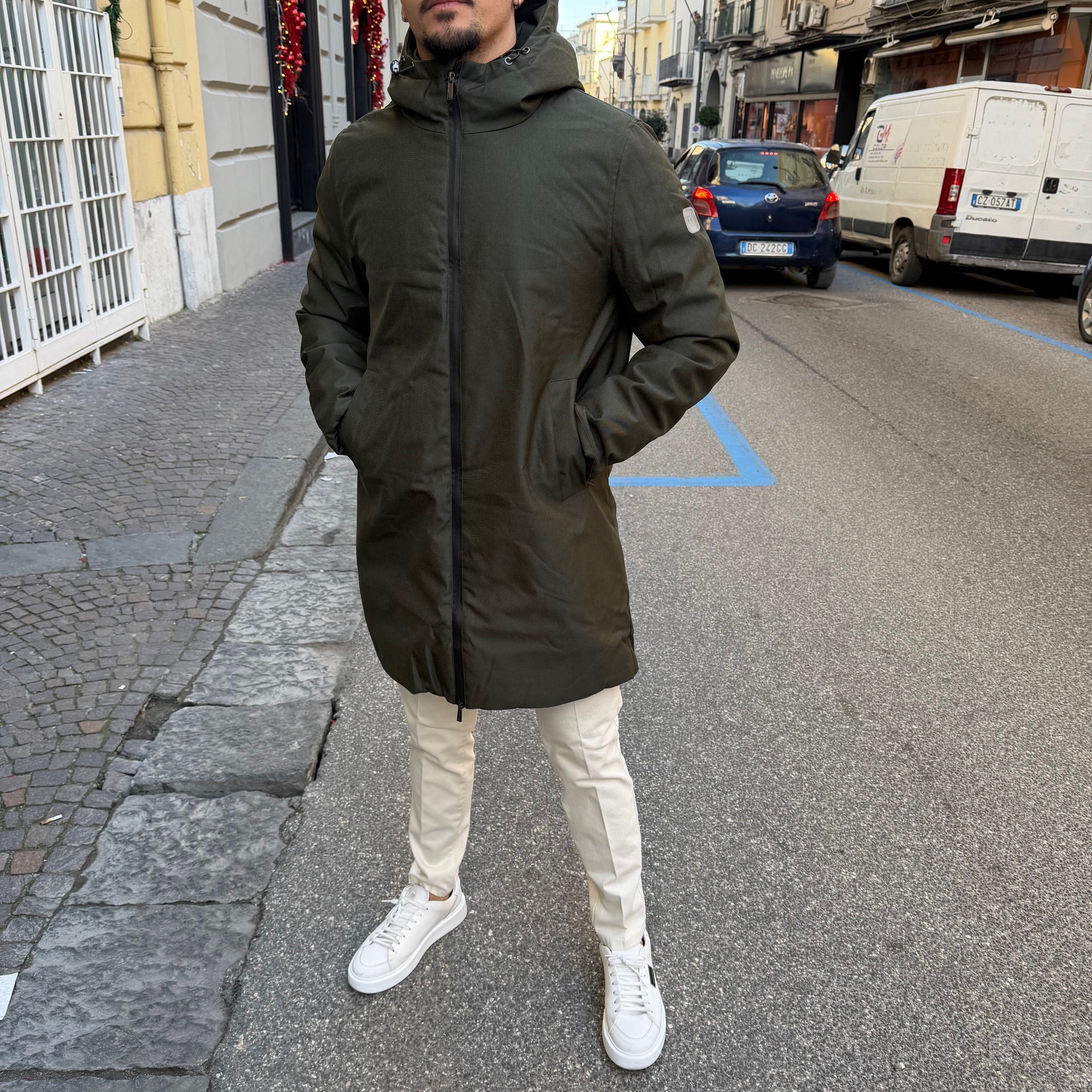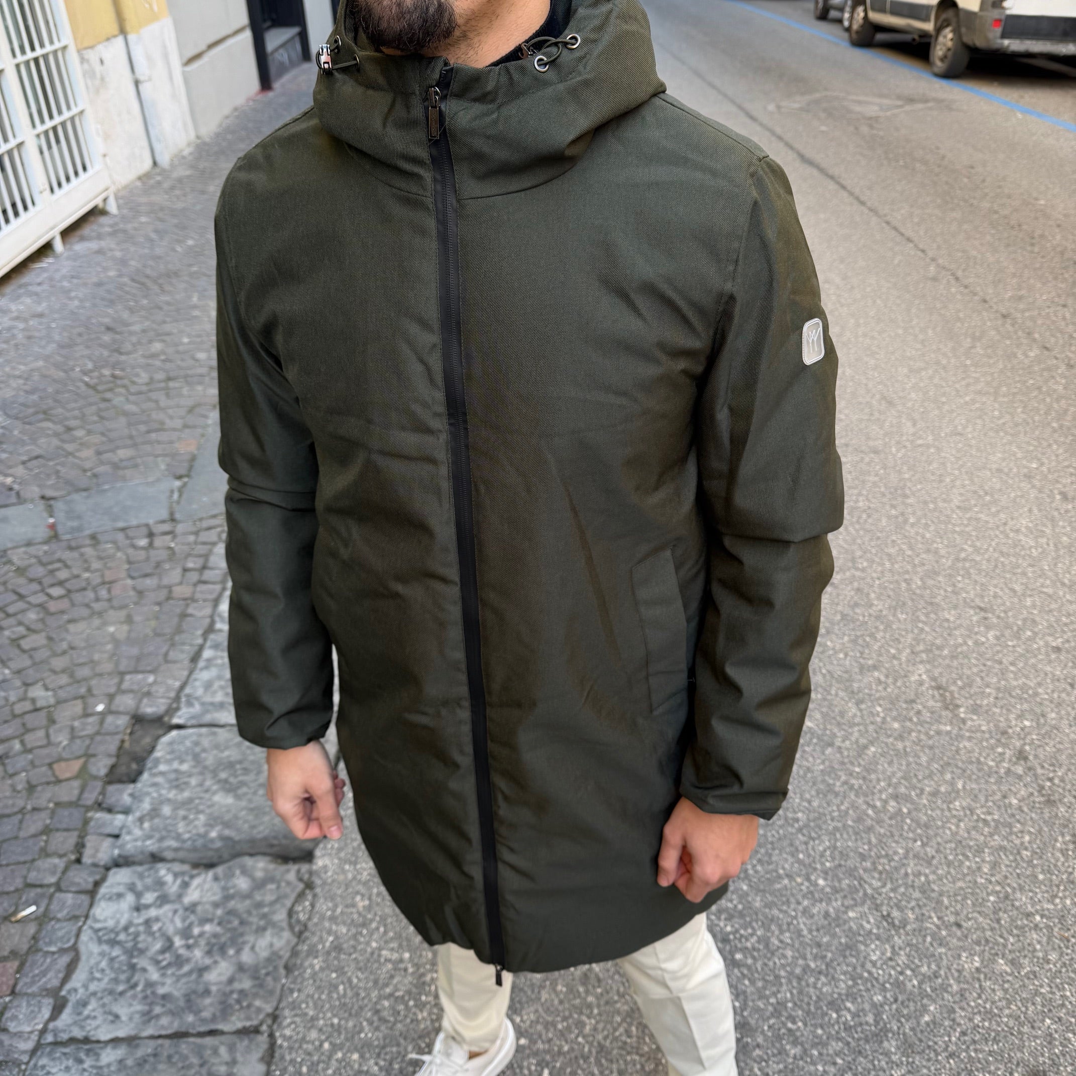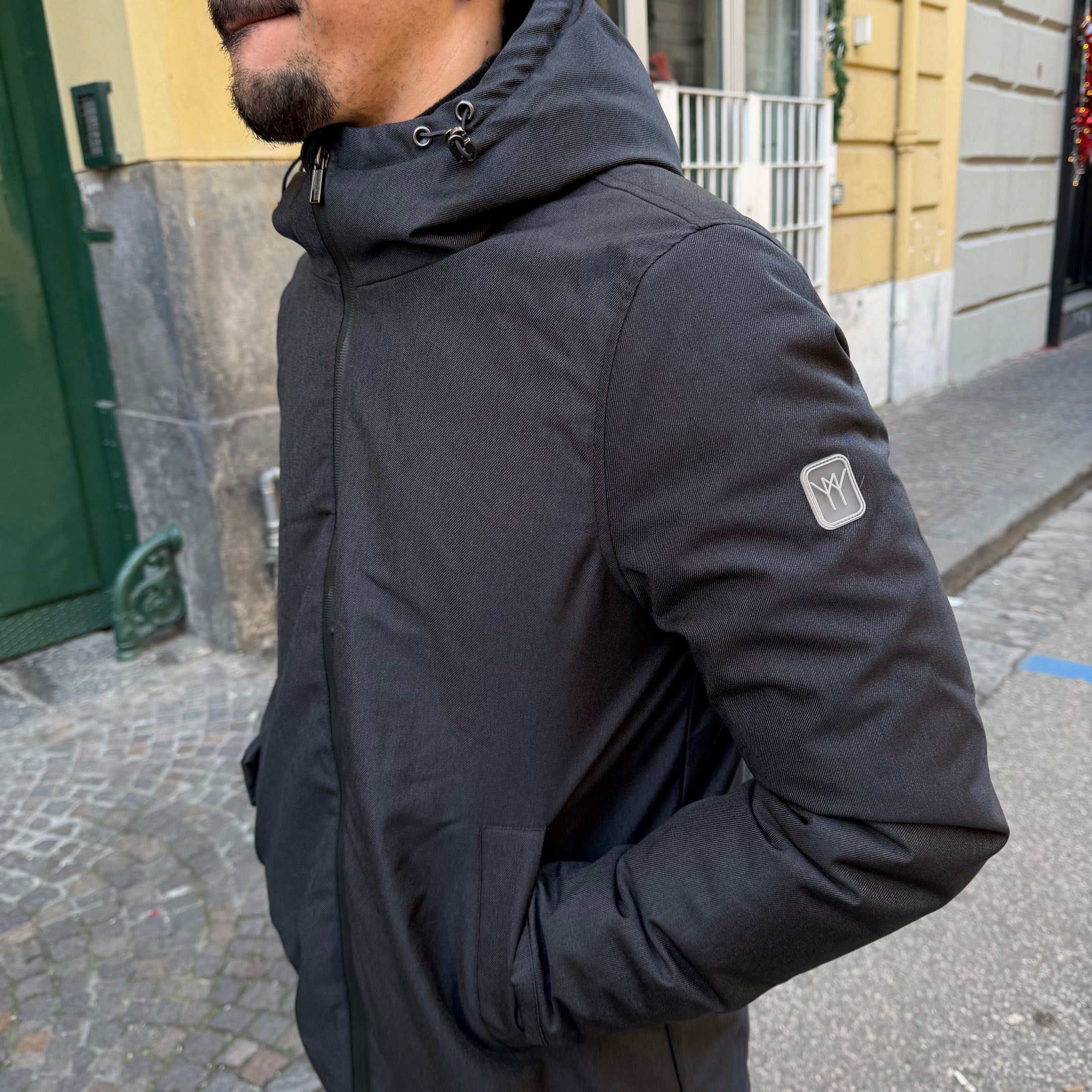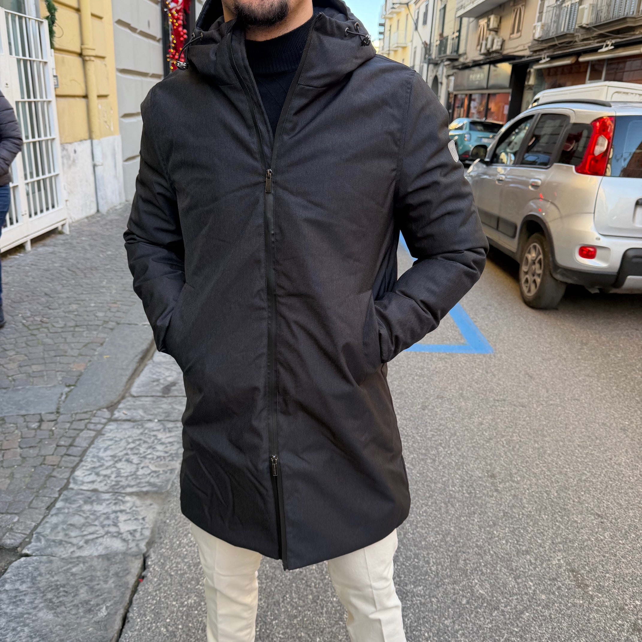 - Realizzato in tessuto tecnico resistente ed elegante che garantisce protezione dal vento e dal freddo