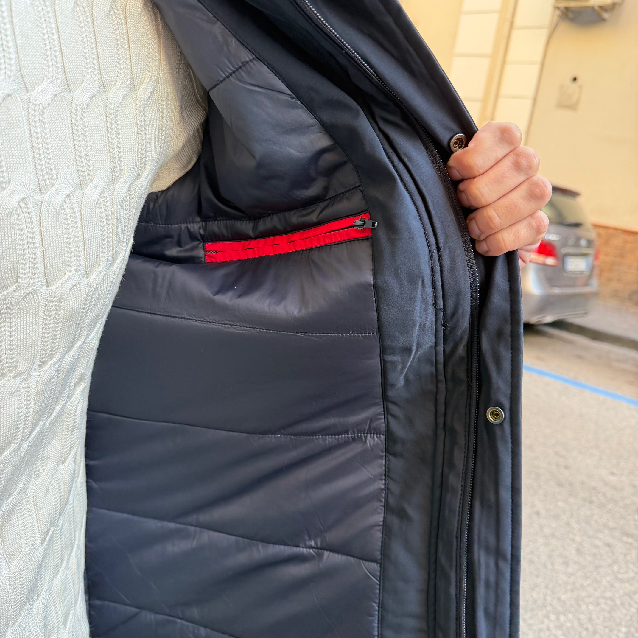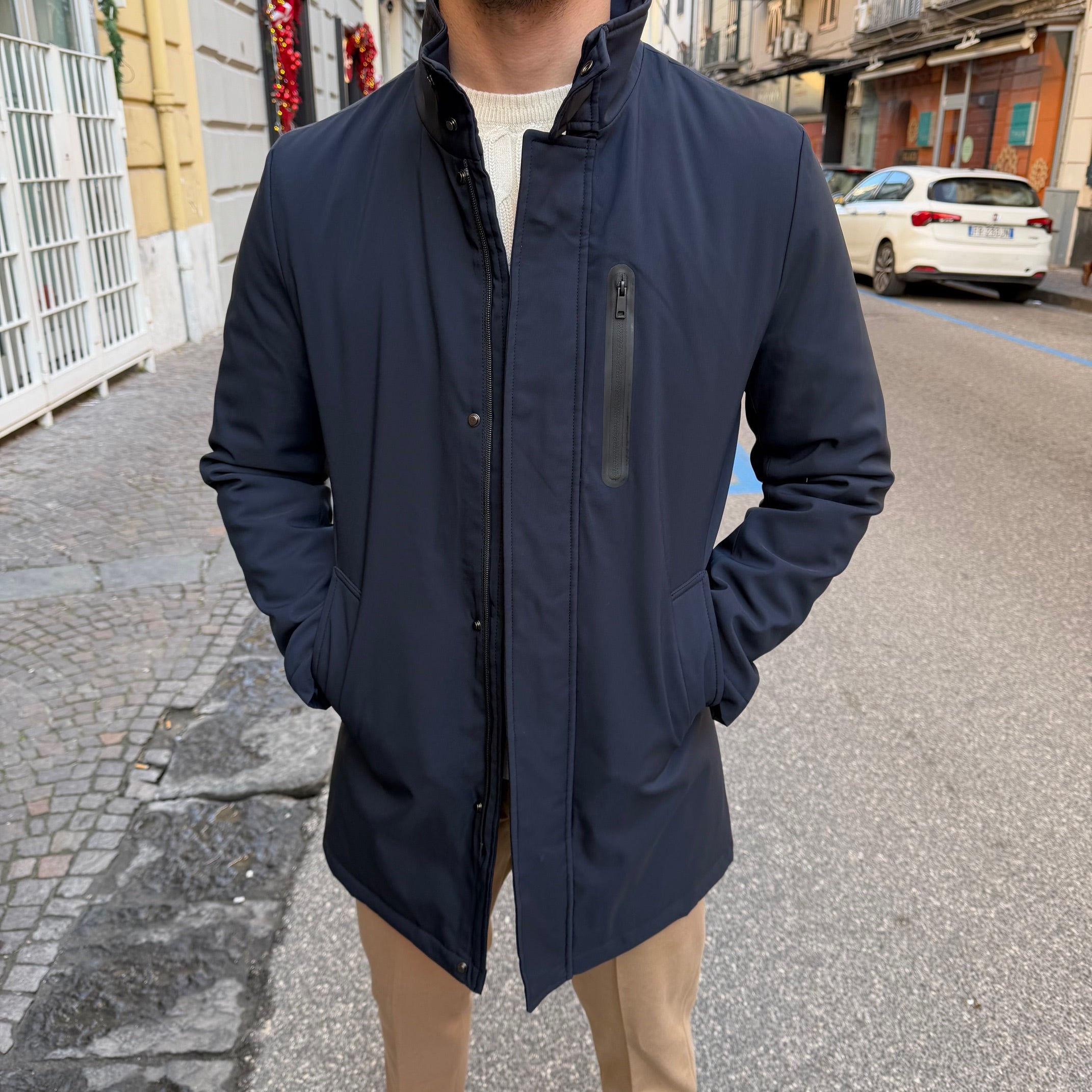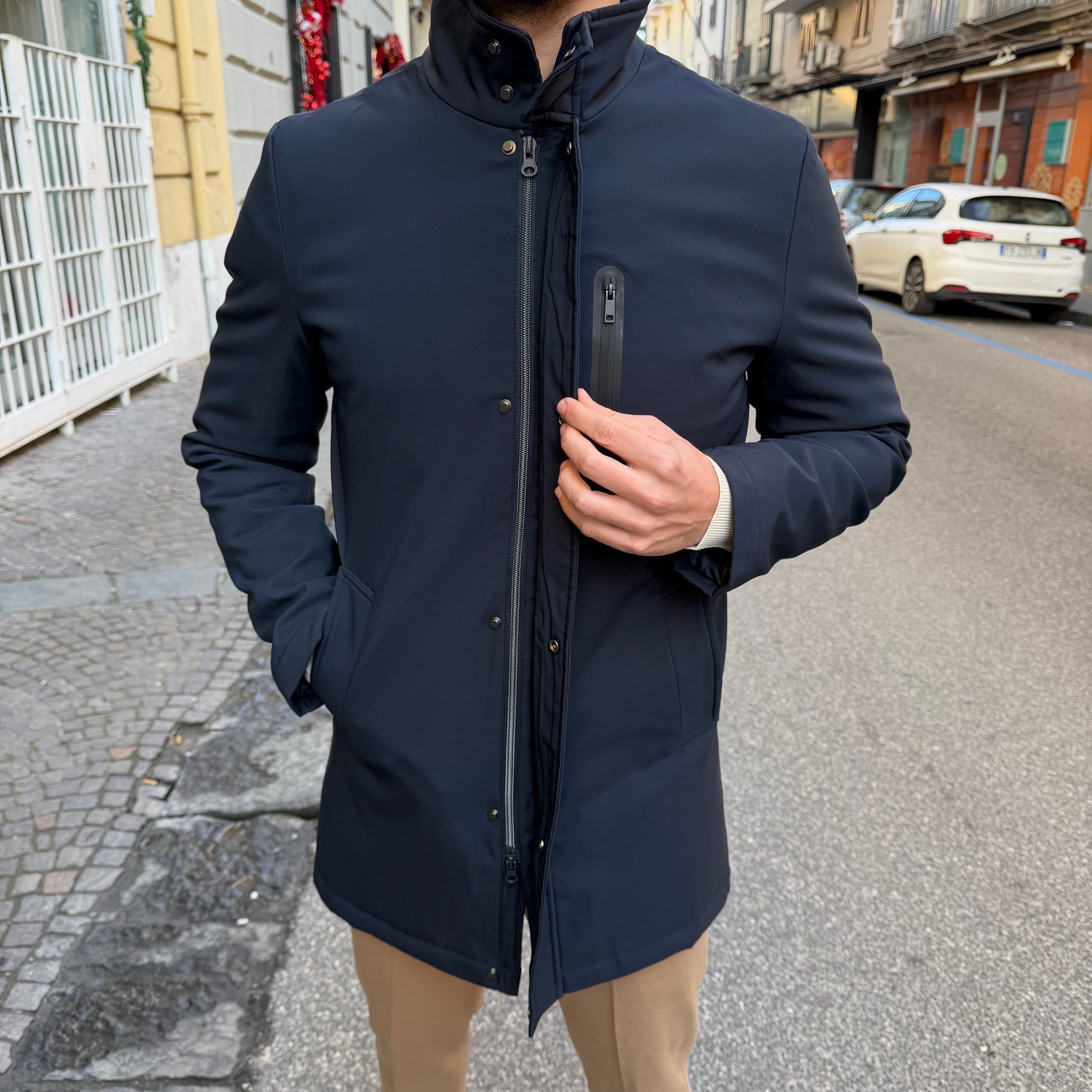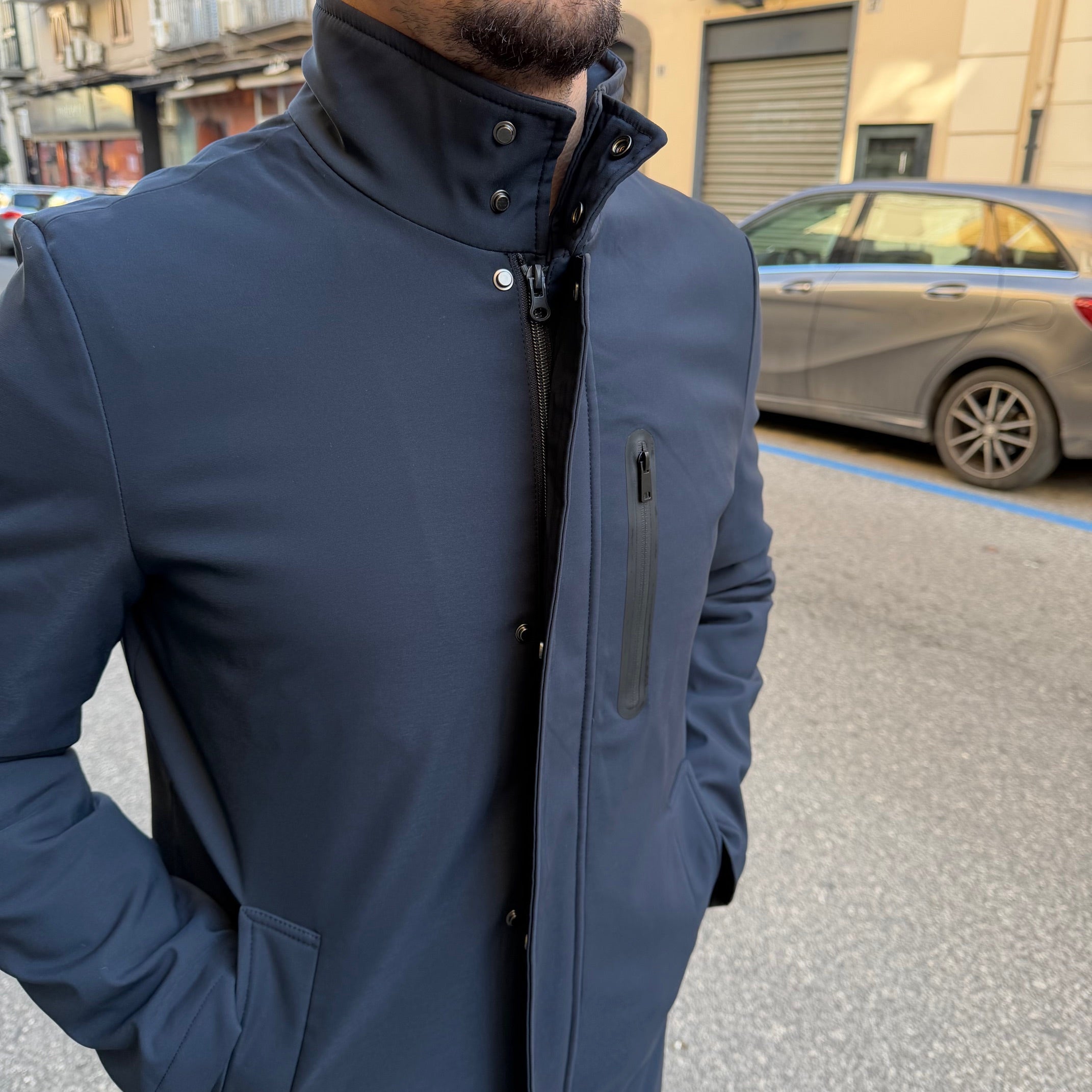 - Design moderno e minimalista con collo alto e zip frontale coperta da patta per una vestibilità protettiva e raffinata