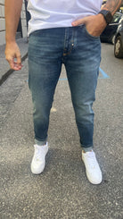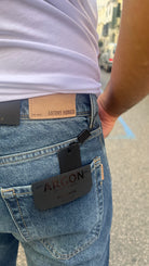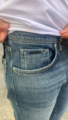 Jeans "Argon" cinque tasche slim lunghezza alla caviglia. La vestibilità di questo modello offre quindi un comfort nella parte superiore, per poi evolvere in una linea più affusolata a livello del ginocchio e un fondo con lunghezza alla caviglia. Realizzato in tessuto denim morbido e confortevole di colore blu, con particolare lavaggio che presenta baffature e una sfumatura a sovratintura beige. Cuciture color tabacco a contrasto, chiusura con zip e bottone. Patch logata applicata sul retro.