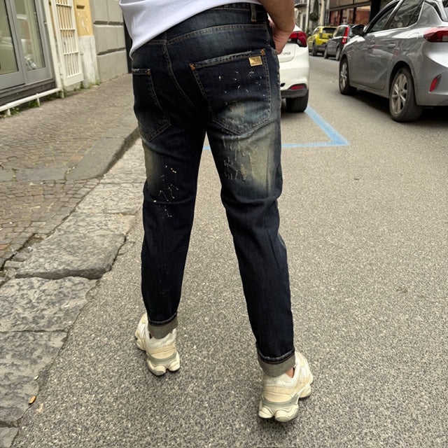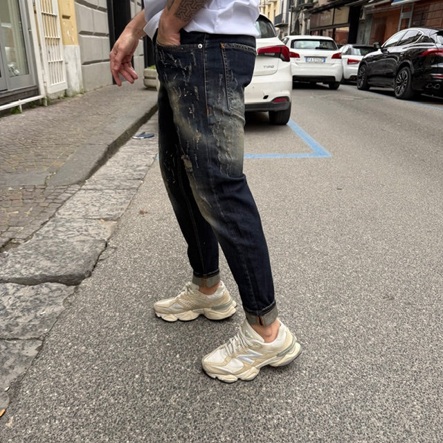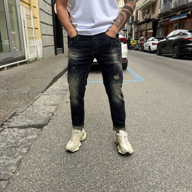 Il design si distingue per gli strappi strategici e le abrasioni effetto vissuto, che donano carattere e personalità al capo. Le sfumature di lavaggio creano un effetto dinamico e moderno, con contrasti studiati per slanciare la figura.