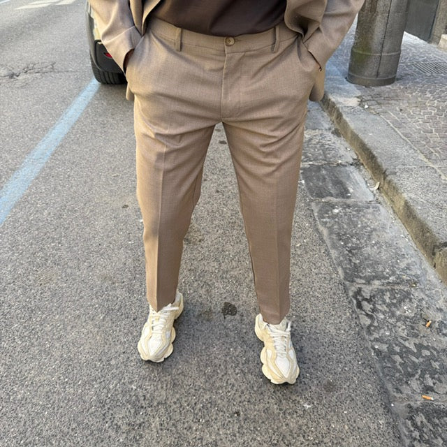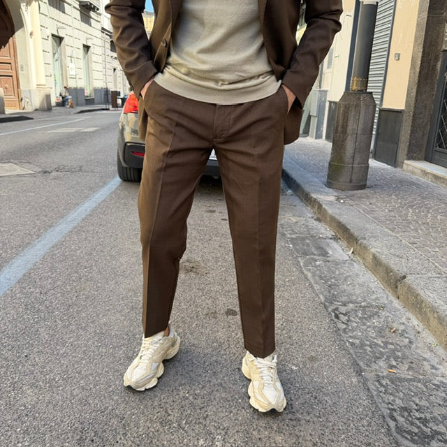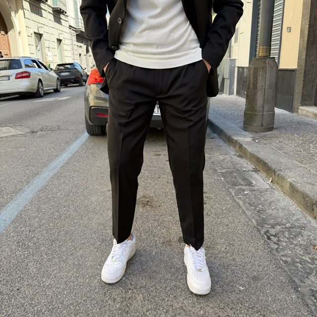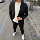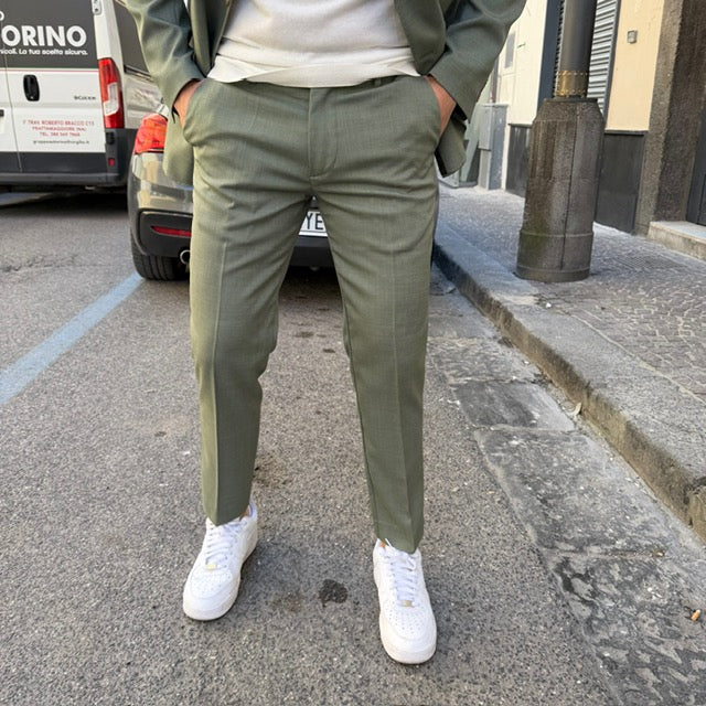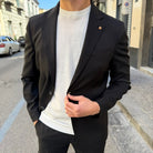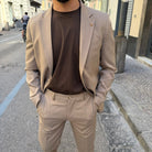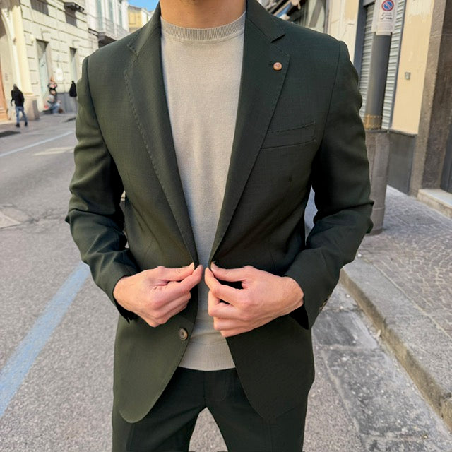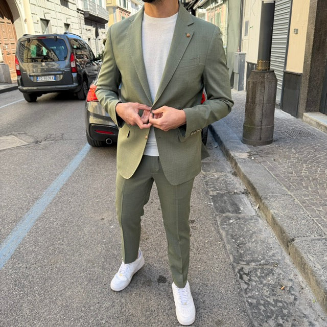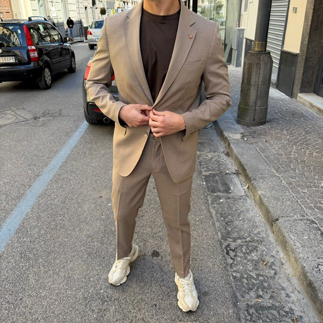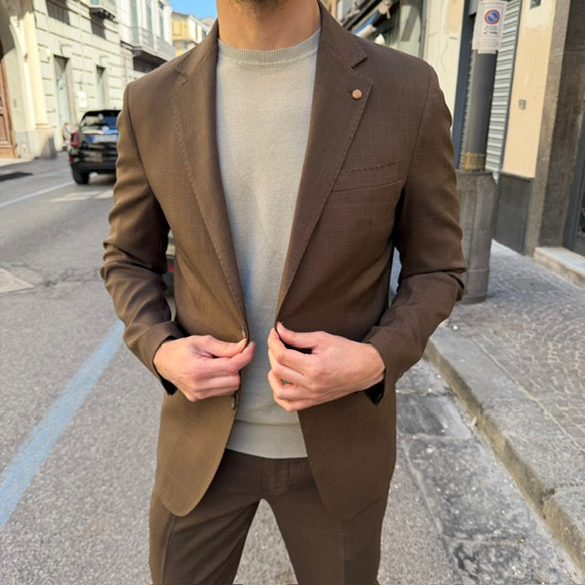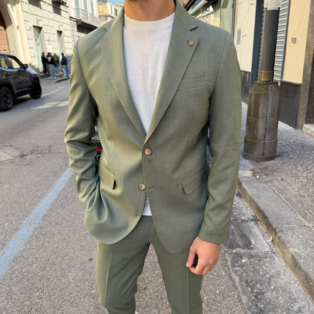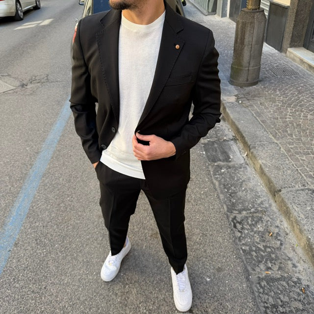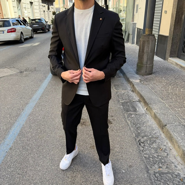 Realizzato con tessuti di alta qualità, questo abito si distingue per la cura dei dettagli: giacca dal taglio sartoriale con rever classico, chiusura a due bottoni e tasche rifinite con precisione; pantalone coordinato dal taglio affusolato che completa un outfit raffinato e versatile.
