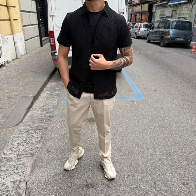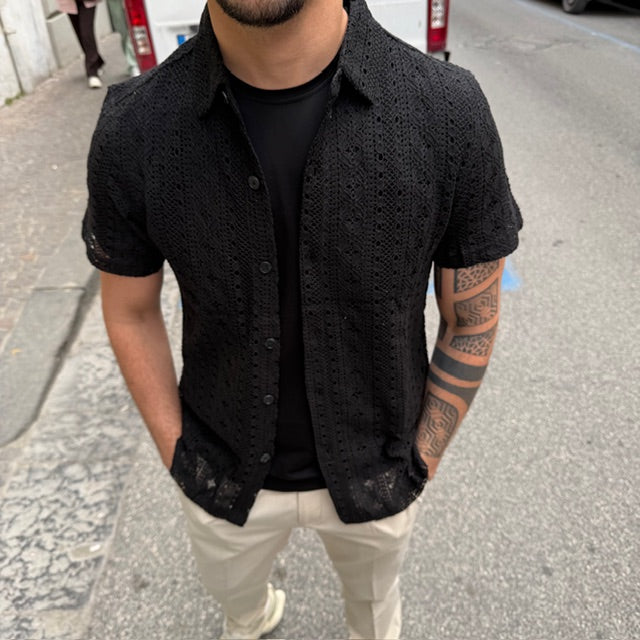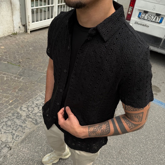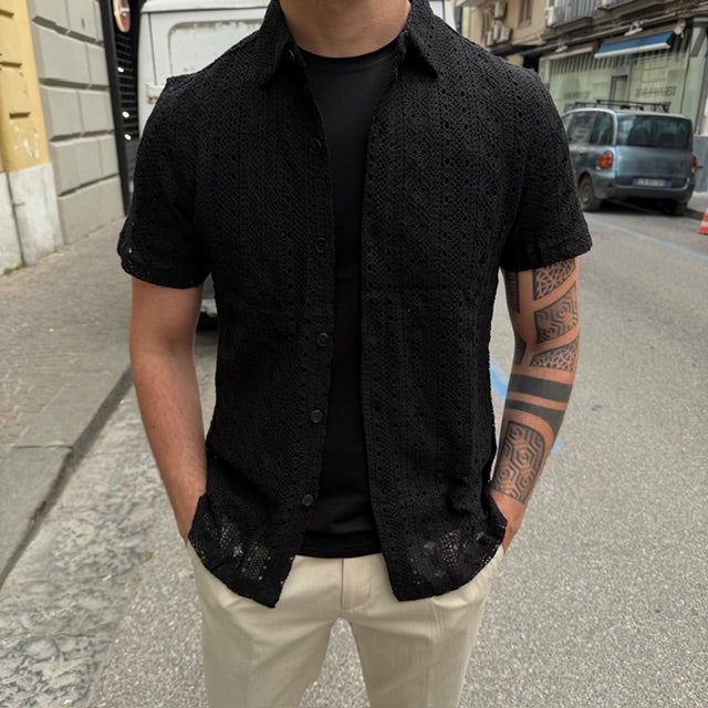 Originale e ricercata, la camicia Gianni Lupo a mezza manica è realizzata in tessuto effetto pizzo, perfetta per chi vuole distinguersi con uno stile contemporaneo e di carattere. La lavorazione traforata dona leggerezza e un tocco sofisticato, ideale per la stagione estiva.