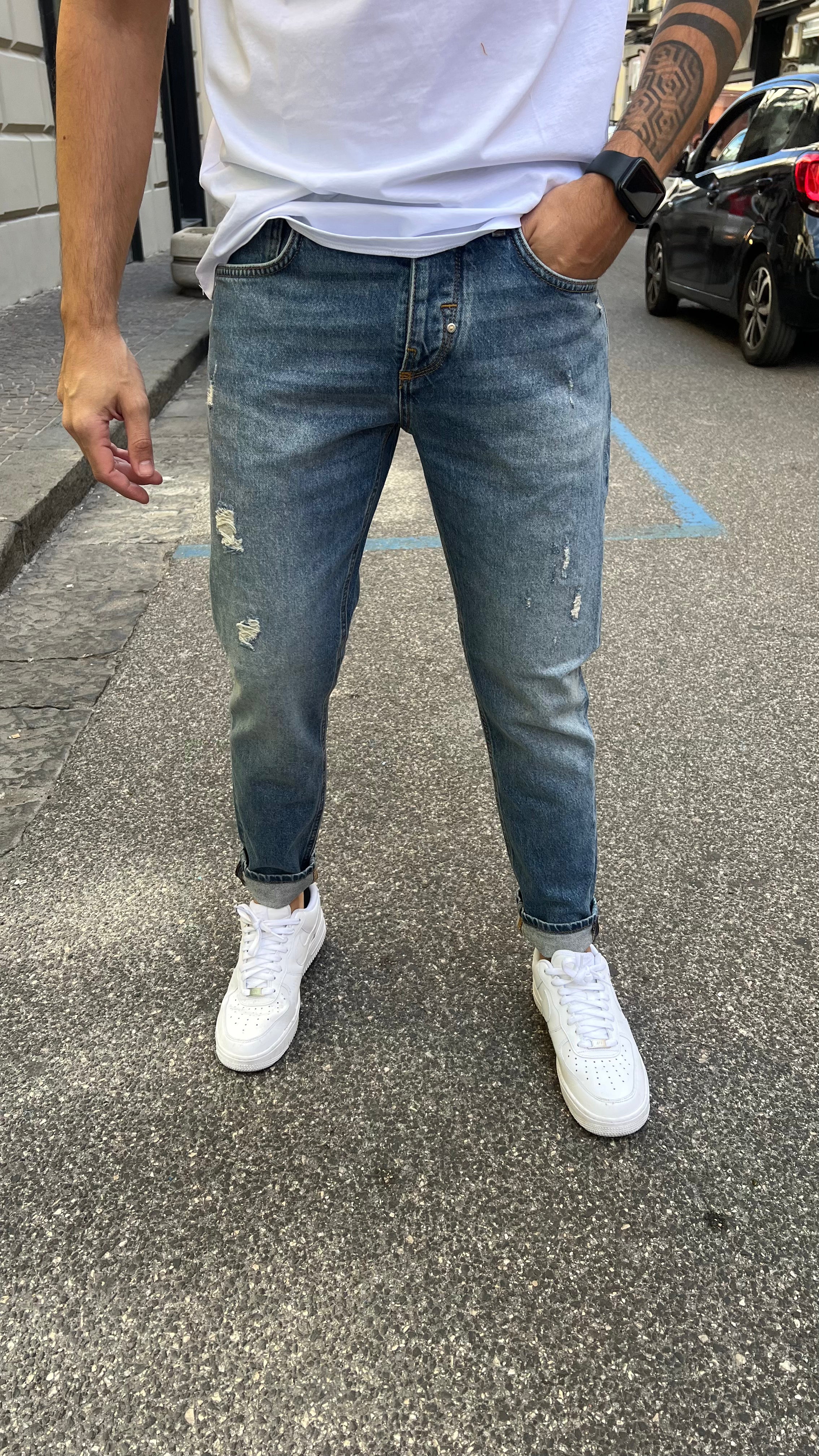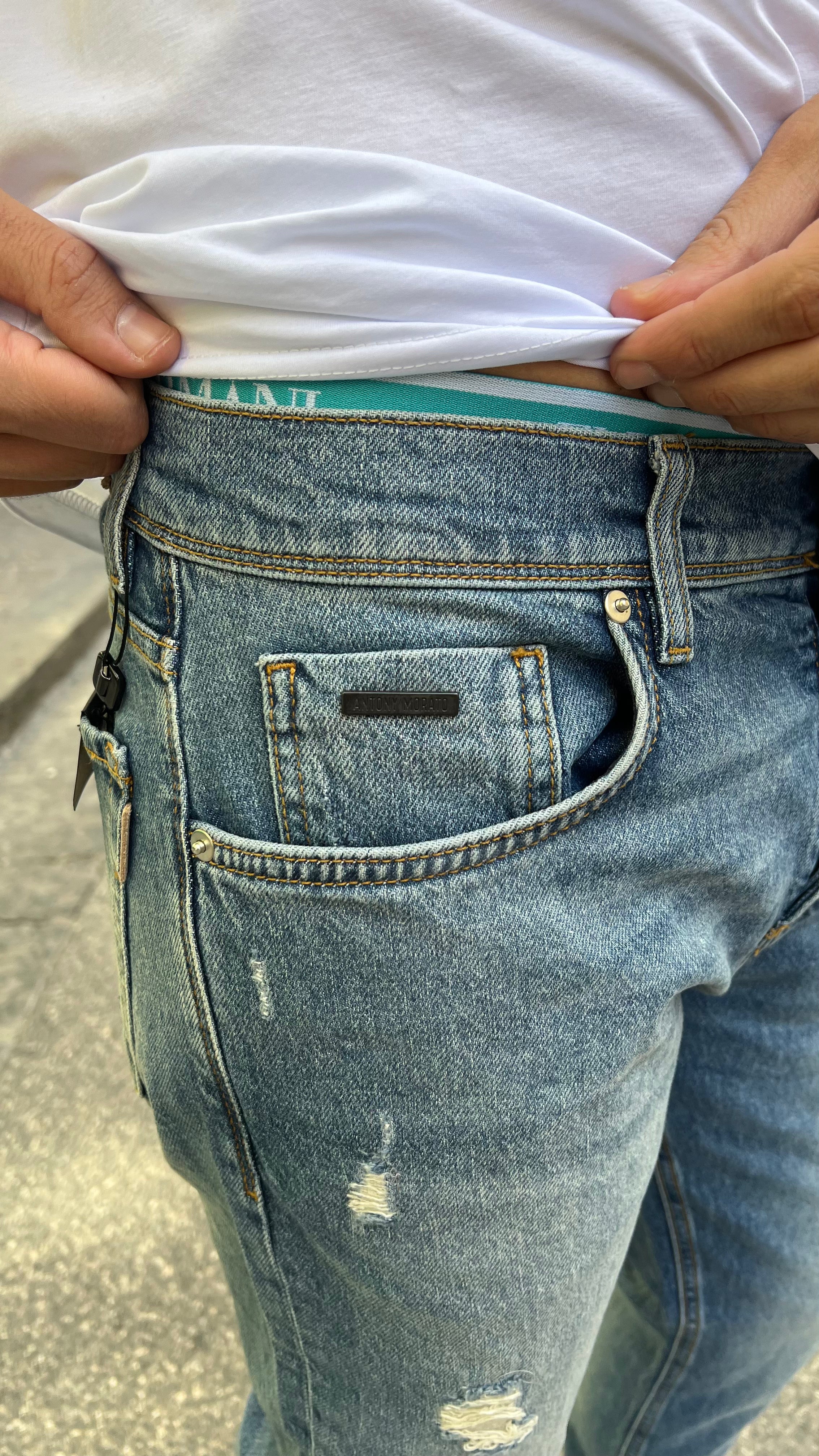 Jeans "Argon" cinque tasche slim lunghezza alla caviglia. La vestibilità di questo modello offre quindi un comfort nella parte superiore, per poi evolvere in una linea più affusolata a livello del ginocchio e un fondo con lunghezza alla caviglia. Realizzato in tessuto denim morbido e confortevole di colore chiaro, con particolare lavaggio che presenta baffature e una sfumatura a sovratintura chiara. Dettagli strappati lungo entrambe le gambe, cuciture color tabacco a contrasto, chiusura con zip e bottone. Patch logata applicata sul retro.