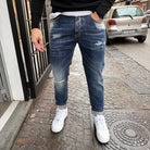 Il design si distingue per gli strappi strategici e le abrasioni effetto vissuto, che donano carattere e personalità al capo. Le sfumature di lavaggio creano un effetto dinamico e moderno, con contrasti studiati per slanciare la figura.