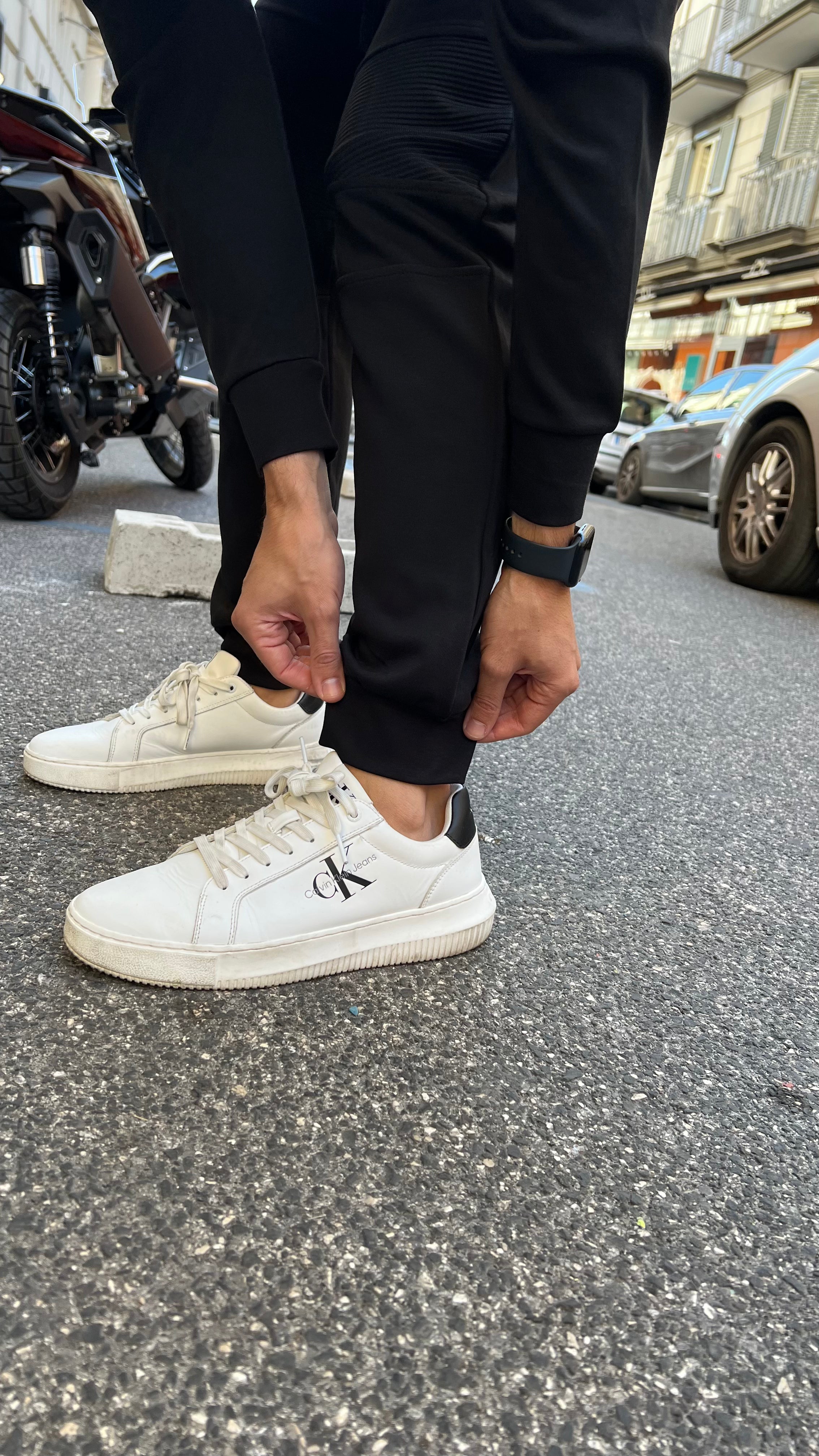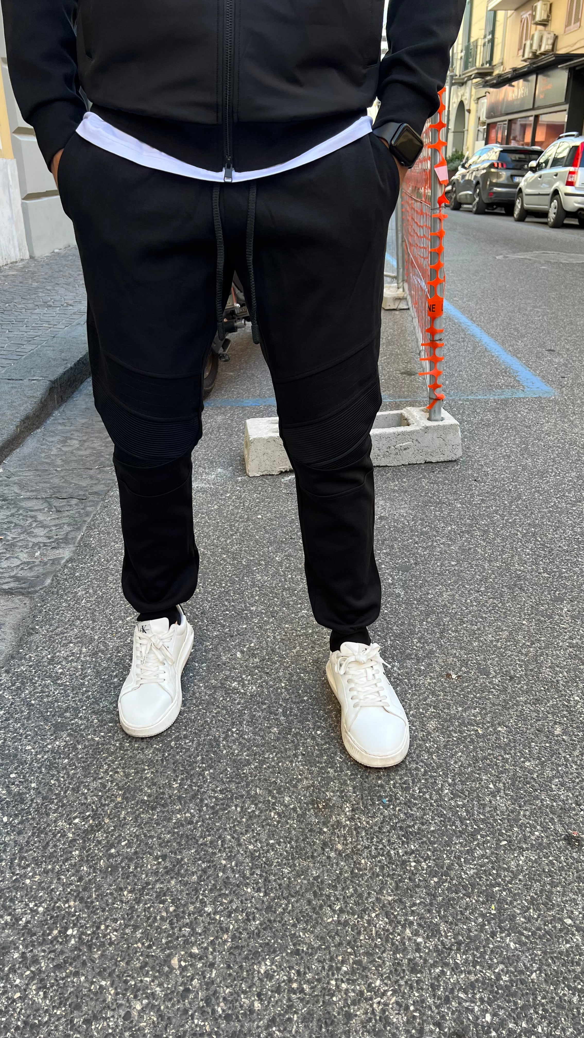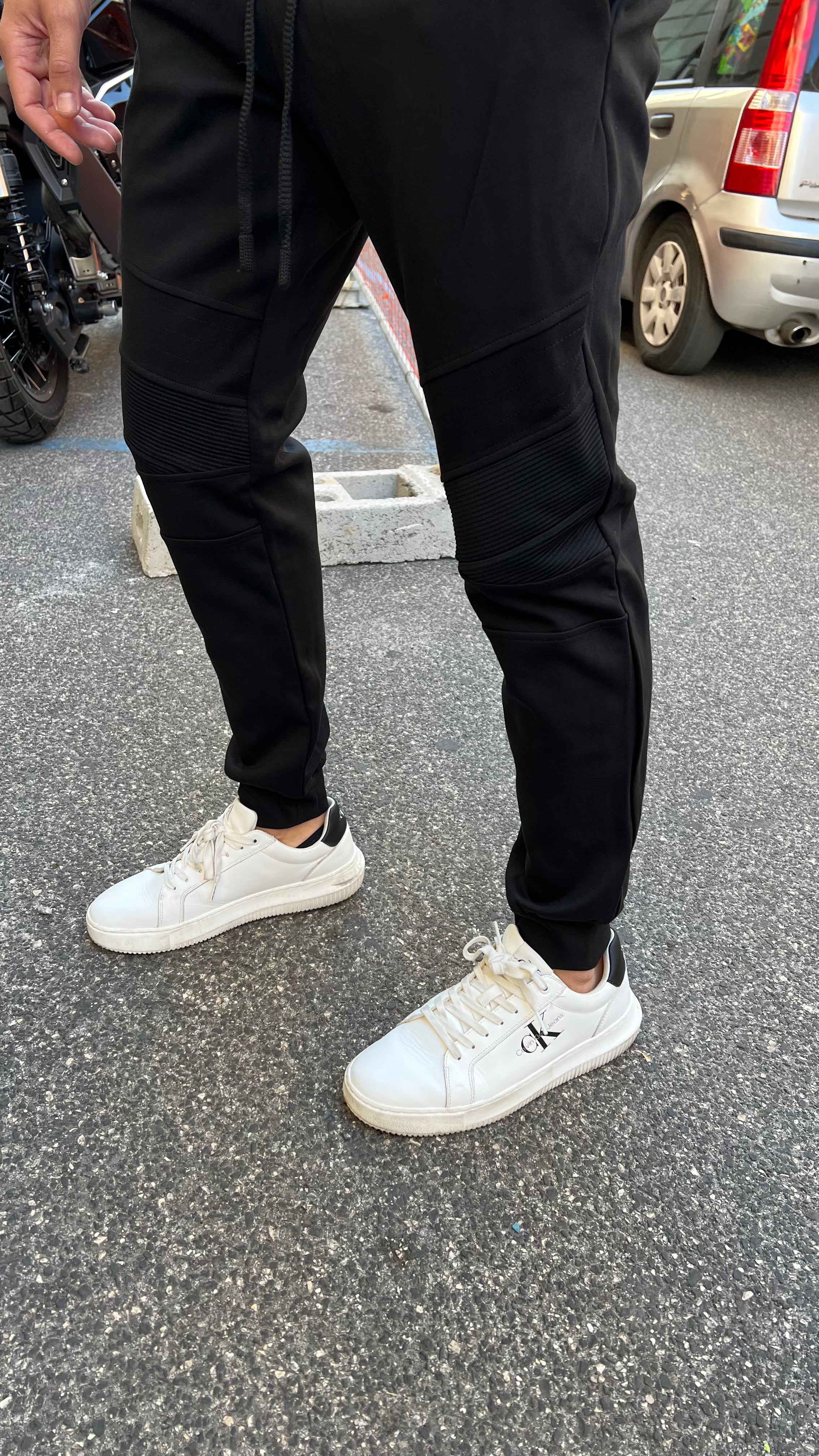 Pantaloni in felpa dalla vestibilità slim fit, realizzati in morbido tessuto misto cotone interlock, compatto e confortevole. Un particolare gioco di cuciture si sviluppa all'altezza delle ginocchia e rende carattere a questo modello. Elastico in vita con laccetti regolabili, due tasche a filetto laterali e due posteriori. Fondo in maglia elastica ad altezza della caviglia. Logo gommato stampato sul taschino posteriore.