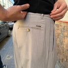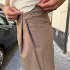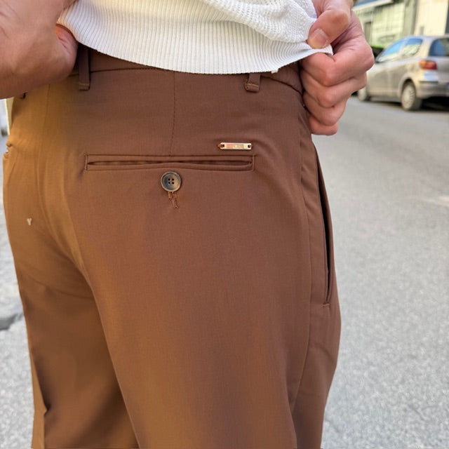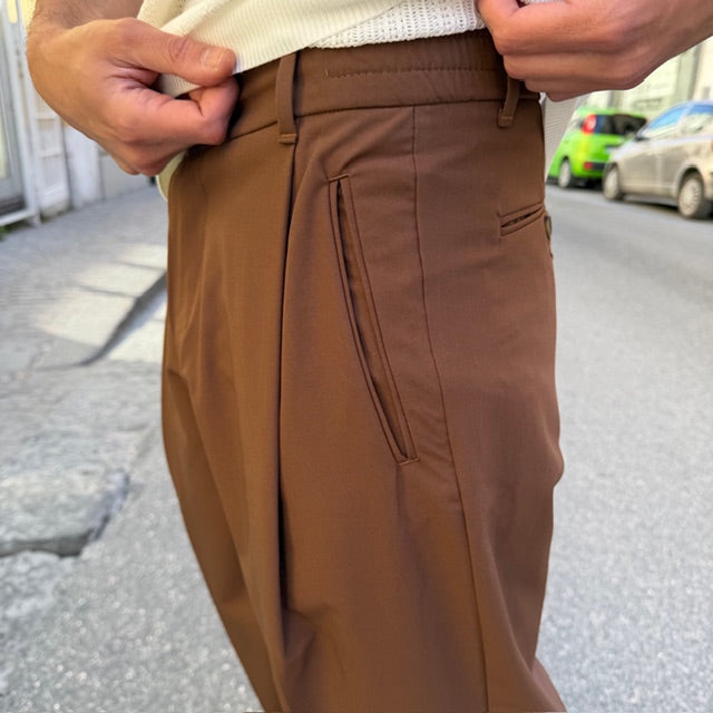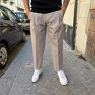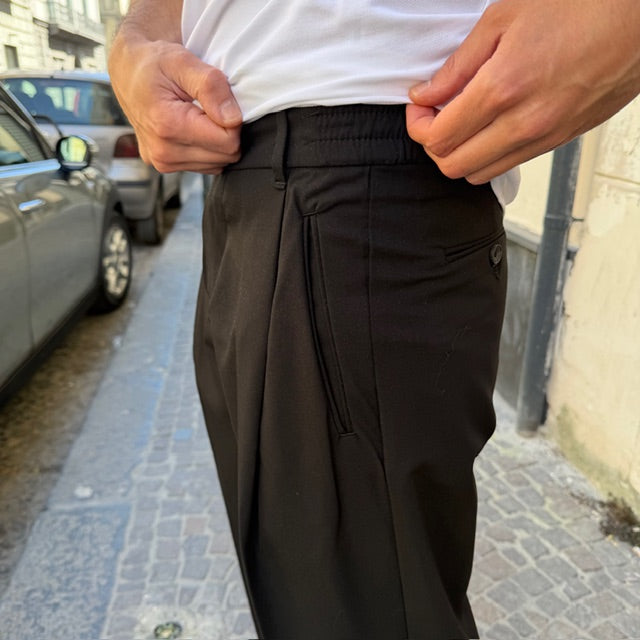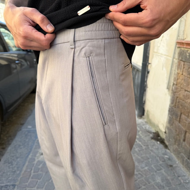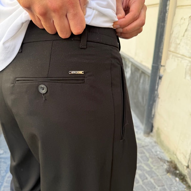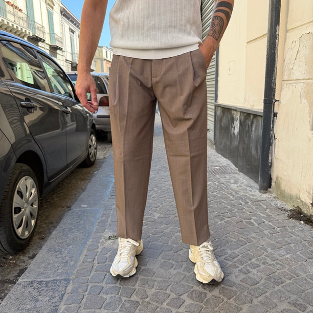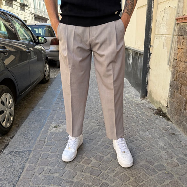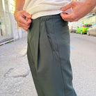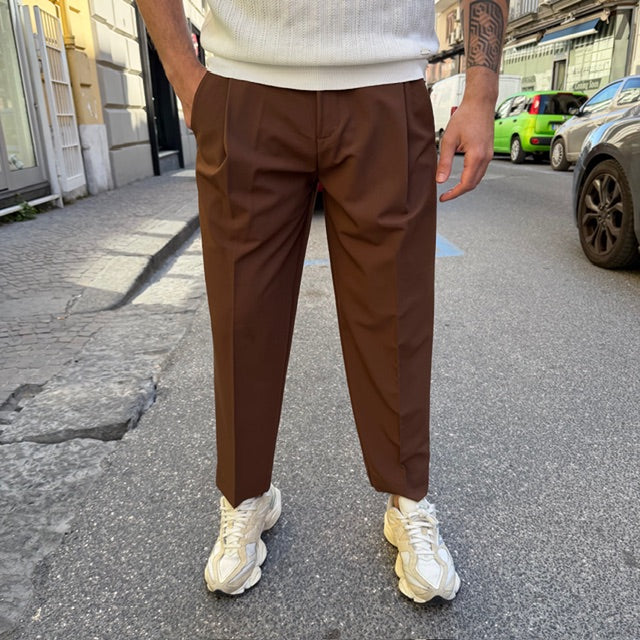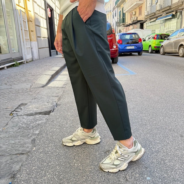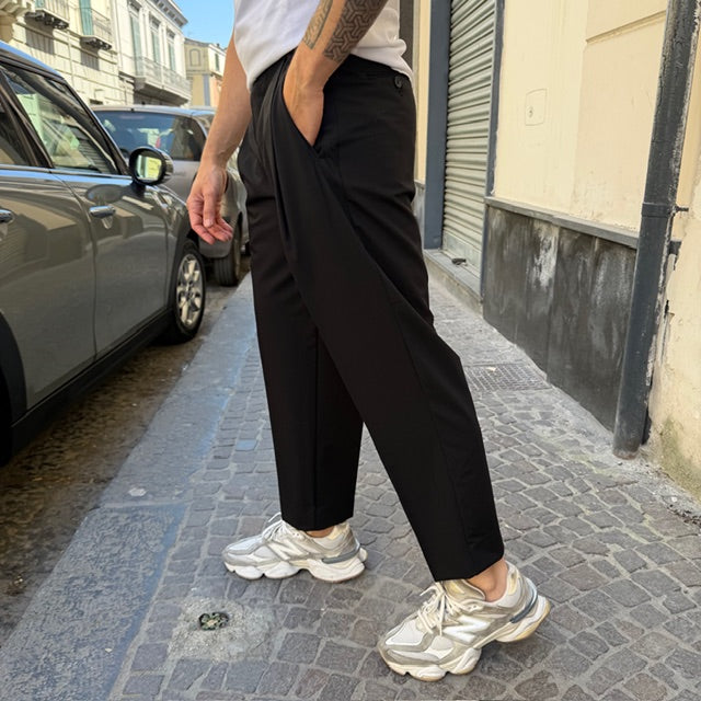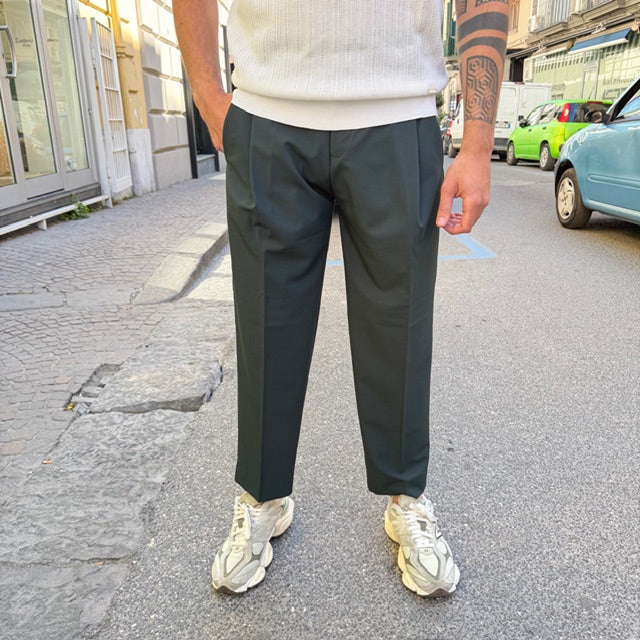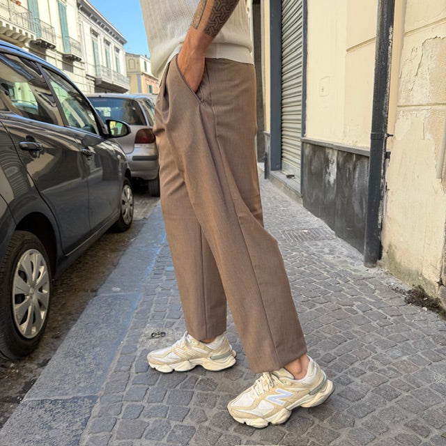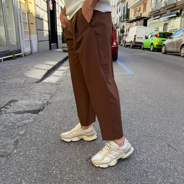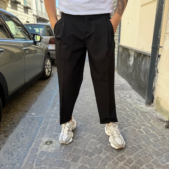 Questi pantaloni cropped a gamba ampia rappresentano un perfetto equilibrio tra sartorialità e stile contemporaneo. Caratterizzati da una linea pulita e da pinces frontali, offrono volume e struttura, valorizzando la silhouette con un’eleganza rilassata.