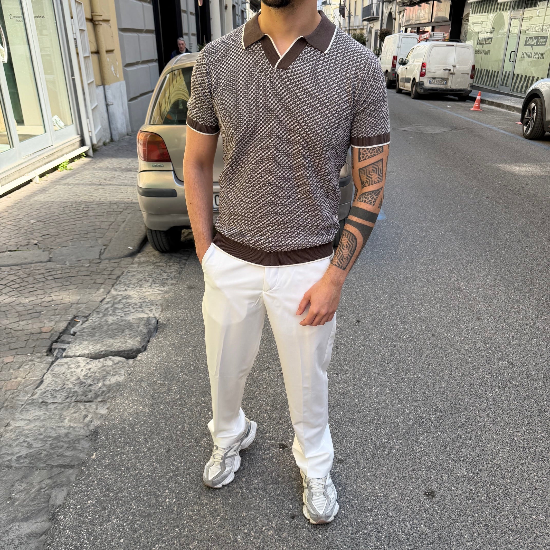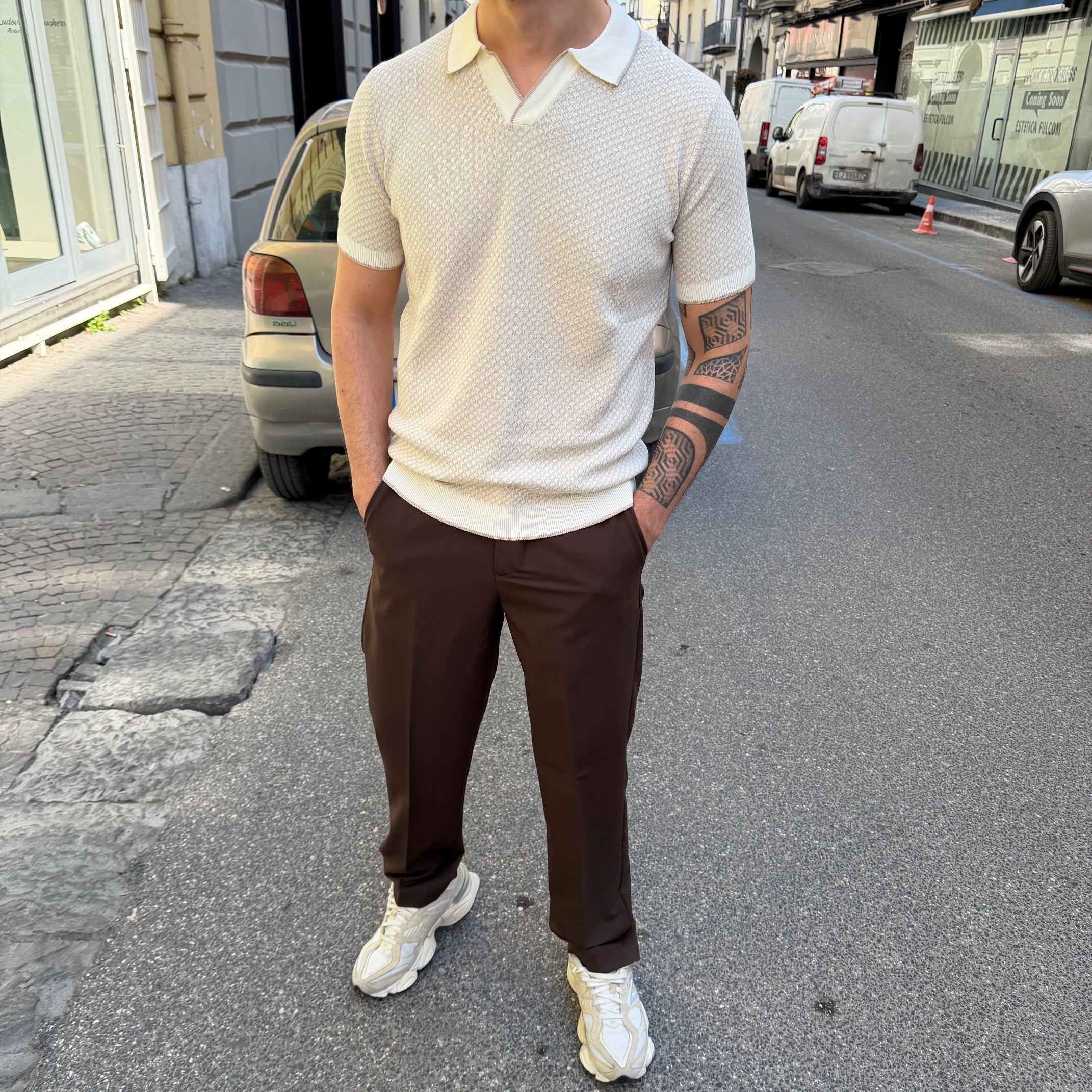 Il taglio slim segue le linee del corpo con precisione, valorizzando la silhouette senza risultare eccessivamente aderente. I polsini sulle maniche aggiungono struttura e carattere al capo, assicurando una vestibilità ordinata e sempre curata.